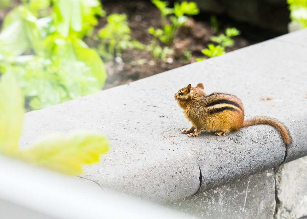 Here are some photos I took of the young chipmunk’s scouting, before his/her burrow building began: